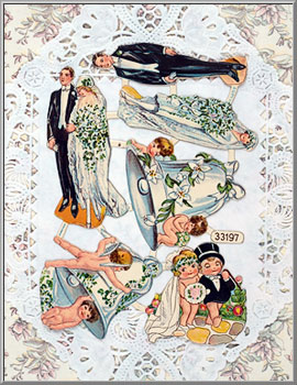 Beautiful brides, handsome grooms and cute cupids are featured in this delightful wedding-themed scraps sheet. Authentic old store stock that dates to the 1920's, the die-cuts are still in mint condition. Produced on a thick, sturdy paper stock and then deeply embossed, it has a soft satin-gloss lacquer finish. The original full sheets were marked with the publisher's trademark of "AGP Co." and "Printed in Germany" with the item number "33197."