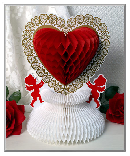 A sweet holiday novelty, this traditional style of honeycomb tissue decoration has been popular in America for more than 100 years! A charming centerpiece that can be enjoyed from both sides, it's a lovely piece to display on a party table. Set atop the three-dimensional, white honeycomb art tissue base, the vibrant red tissue heart has a lacy, die-cut cardboard border.
