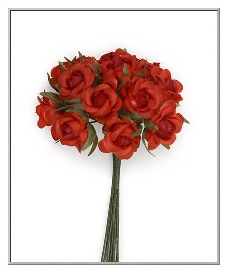Dainty little flowers that look like rose buds just opening into full bloom, the bright red hue makes them a favorite floral accent from Valentine's Day thru Christmas. Made of silky red fabric, the added touch of green sepals lend the roses a more naturalistic look. Made by hand, they have stems of green paper-covered wire. From Austria.
