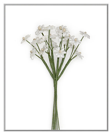 Tiny double flowers of pure white, each ruffled paper bloom has a butter yellow stamen center. Each spray is composed of six individual sprigs that have three little flowers on each. Light and airy in aspect, this sprightly baby's breath spray will add a fresh look to any floral bouquet. Thin stems are made of light green, paper-covered wire. Austria.