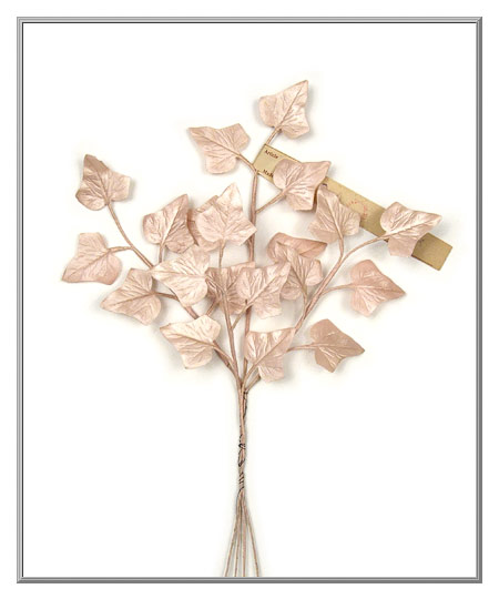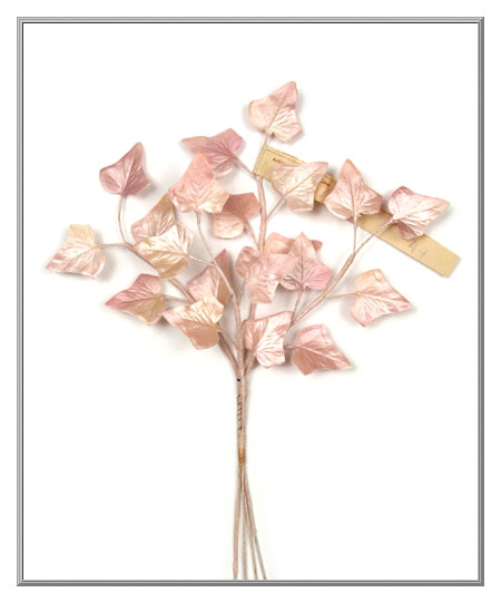 Delicate in both color and appearance, this pretty pink ivy looks like was grown in a fairy's own garden! Created using die-cut and embossed fabric leaves with a beautiful pearlized finish which gives them a subtle sheen. Stems are made from pink paper-wrapped wire. Original paper label still on the spray is printed "Made in Germany" and then is stamped with "U.S.S.R. occupied."