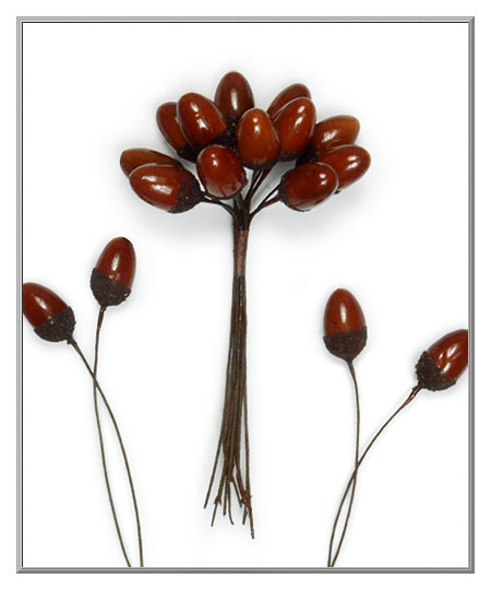 These European millinery acorns are a rich, glossy chestnut red color with dark brown "bumpy" caps for a natural look. Wonderful little accents for all kinds of Fall decorating, they're especially nifty to use at Halloween and Thanksgiving, too. Dipped-lacquer nuts have a hard enamel shell; the stems are of brown paper-covered wire. Austria.